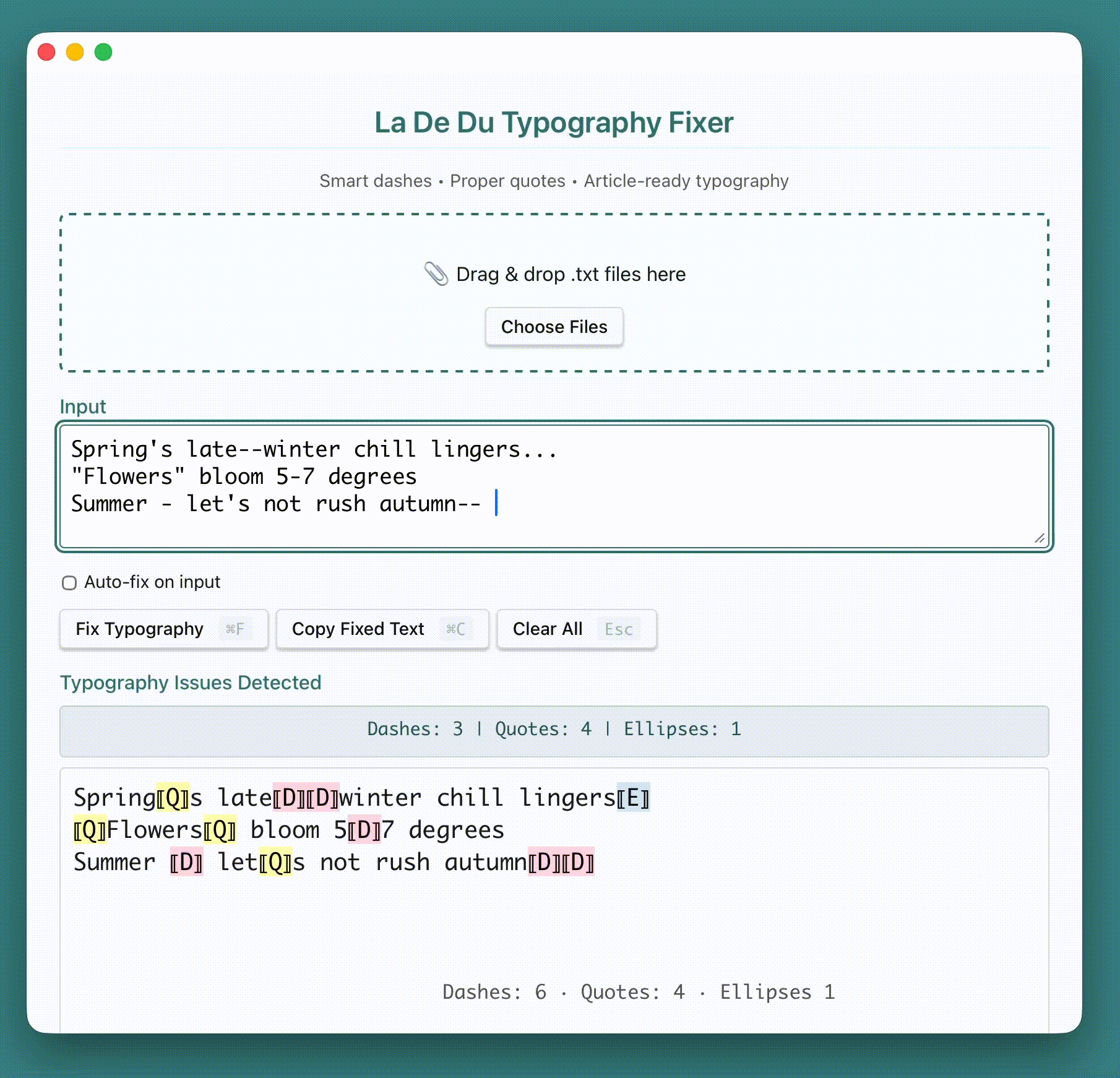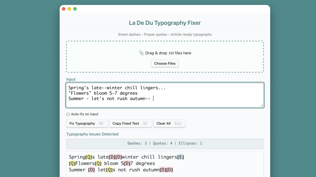 You’ve written something great — but the quotes are straight, the dashes are wrong, and those ellipses… aren’t quite right. Typography Fixer PRO cleans up your text automatically, turning carefree punctuation into proper typography.